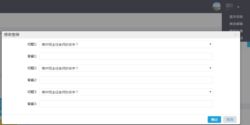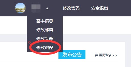 ②设置密保问题:右上角,点击个人名字旁边的小三角,点击“修改密保”,选择三个不一样的问题,填入你个人的答案即可。
