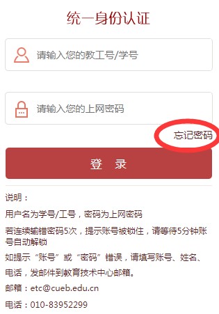 今后,若忘记统一身份认证密码,在登录框右下点击“忘记密码”链接,便可通过邮箱或者密保问题找回密码。