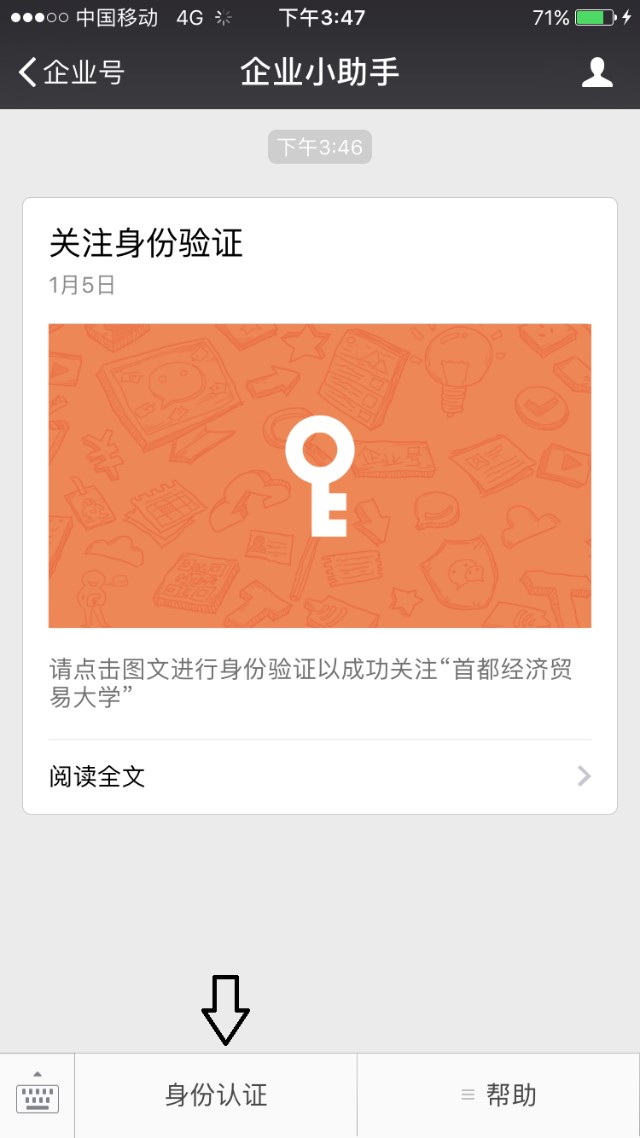 其次,通过企业小助手下方的“身份认证”按钮认证(注意:不要点击图文消息进行认证),